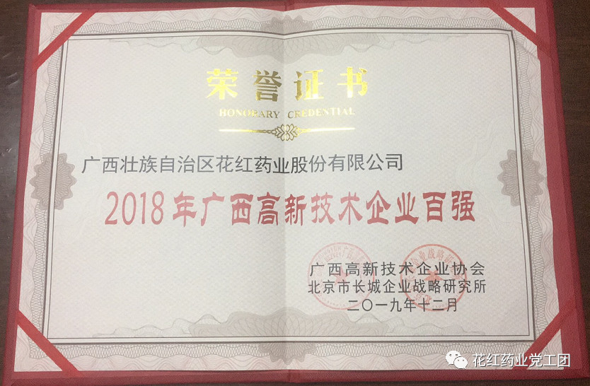 2019/12:12月24日,花紅藥業(yè)榮獲“2018年廣西高新技術(shù)企業(yè)百強(qiáng)”稱號。