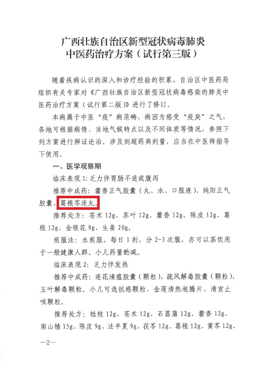 2021/08:8月13日,葛根芩連丸入選《廣西壯族自治區(qū)2021年新型冠狀病毒肺炎中醫(yī)藥預(yù)防方案(試行)》。