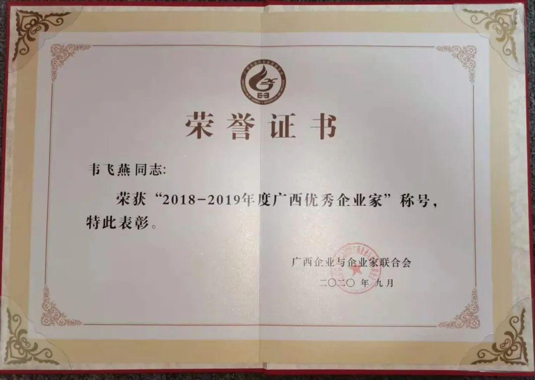 2020/08: 花紅藥業(yè)董事長榮獲 “2018-2019年度廣西優(yōu)秀企業(yè)家”榮譽(yù)稱號。